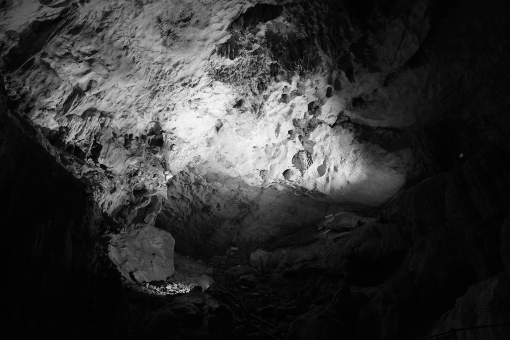 さあ、いよいよ入洞しました。最初はちょっとモノクロ処理で脅かしておいて実際の大きさを表す写真は次回にとっておきます。自然が作り出した巨大な洞は人間の常識を履がします。