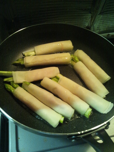 | 1 アスパラを半分に切って3本くらいずつにして、 それに豚肉を巻き、その上にさらに春巻きの皮 を巻きます。 フライパンに油を熱して焼いていきます。 | |