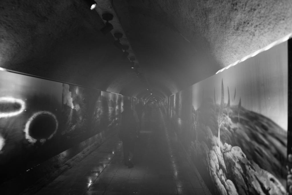 失敗の成功・・洞窟を出た後、地上に続く道があるのですが、湿度と温度が大幅に違うために、レンズが曇っていました。ファインダーでは確認できず、改めてみてびっくりの写真。モノクロ処理をしたら意外としっかりとした写真に変身。こういうこともあるので写真は面白いと思います。