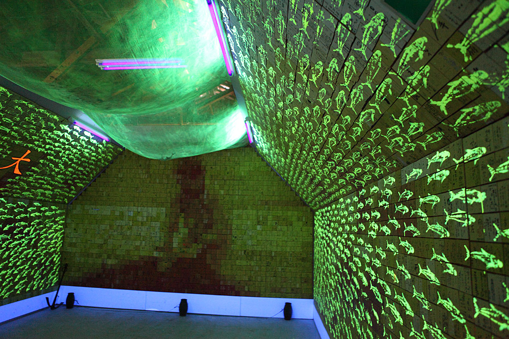 ここはちょっと珍しいところです。壁一面に光っているものは「かまぼこの板」です。ライティングが時間とともに変化していきます。かまぼこの板には、一人一人の願いや言葉が記入されており、全体で海を表現しているそうです。壁に映るちょっと怖い感じの絵は、猟師が網を手入れしている風景だそうです。