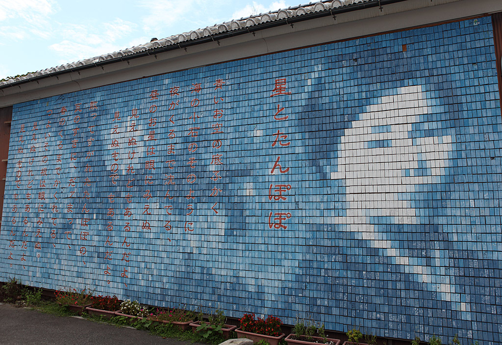 金子みすず記念館の前の駐車場の壁画。これもかまぼこの板で作成されています。遠くからみると金子みすずさんの顔に見えるようになっています。近くで見ると、とてもそうは思えません。