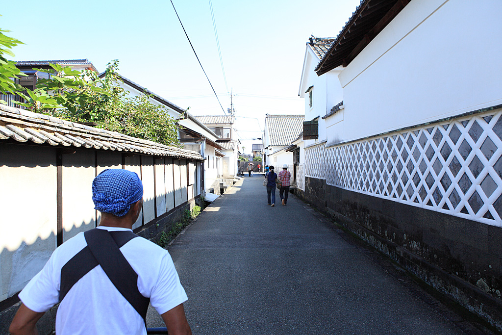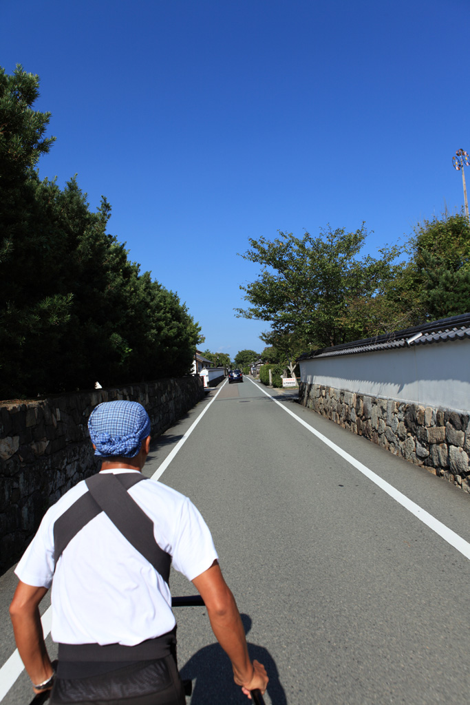 白い格子模様の壁の横を人力車に乗って駆け抜けていきます。人力車からの撮影はかなり難しいです。常時揺れていますのですぐに手ブレをしてしまいます。