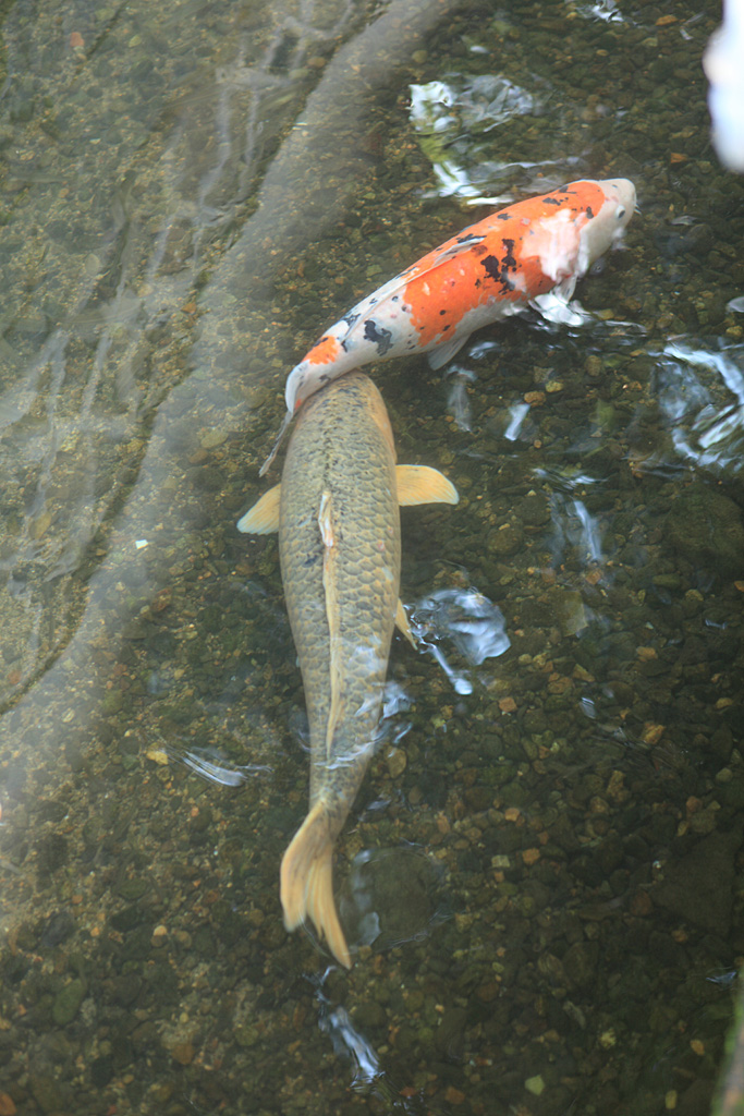 水面の魚を撮影するのは中々難しいのですが、おとなしい鯉で助かりました。ここまでスローな動きであればあとは光の乱反射を見切り、撮影するだけです。奥がわの色鮮やかな鯉の模様も表現できました。
