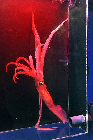 その珍客中の珍客を迎えた新江ノ島水族館では、深海イカには暗黒と感じられる赤ライト照明の特別水槽で飼育を開始。が、やはり水圧の変化で弱っていたのか翌16日には息絶えてしまう。事態はここから意外な展開を見せ始める。なんと、同日に相模湾西部の静岡県・熱海沖でも生きたユウレイイカが揚がり、新江ノ島水族館へ新たに持ち込まれたのだ。同館の飼育担当・北嶋円(まどか)氏が説明する。
