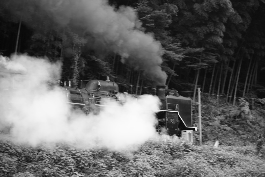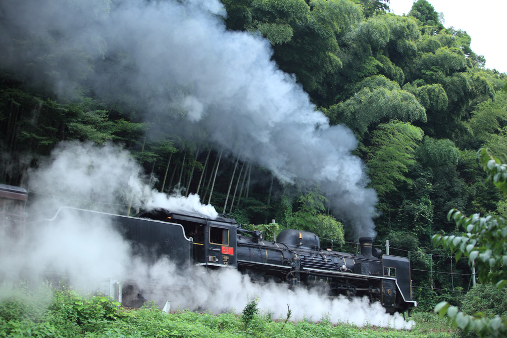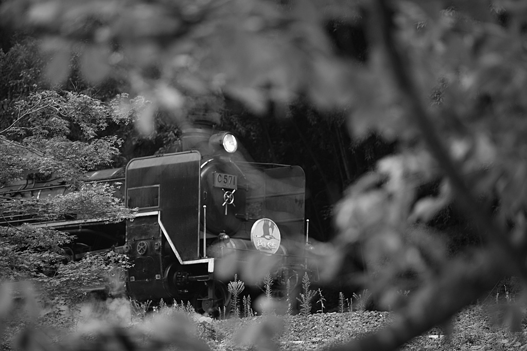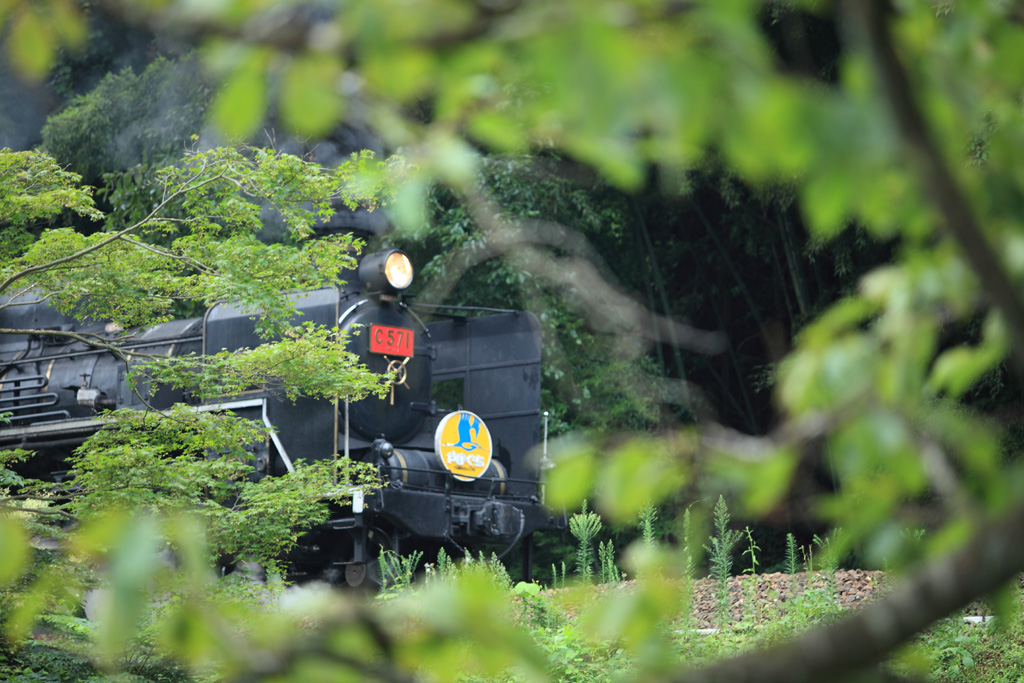 緑のトンネルの向こうに、力強いSLが迫ってくる感じを表現してみました。手前がゴチャとしていますが、木々の間を探してあえて撮影してみました。