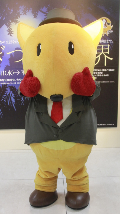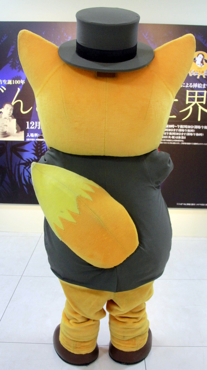 南吉ゆずりの帽子とジャケット、童話「てぶくろを買いに」にちなんだ手袋をつけた狐で新美南吉の弟子。