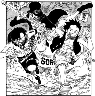 これはおそらくルフィ達が食い逃げして逃げている写真でしょうか。ルフィ、エースと並び後ろに大人になったサボがいます!これは一体どういうことでしょうか。おそらくサボが生きていることが確実になる証拠になってきましたがこれを見るとサボがローだった説が薄れてきますね。