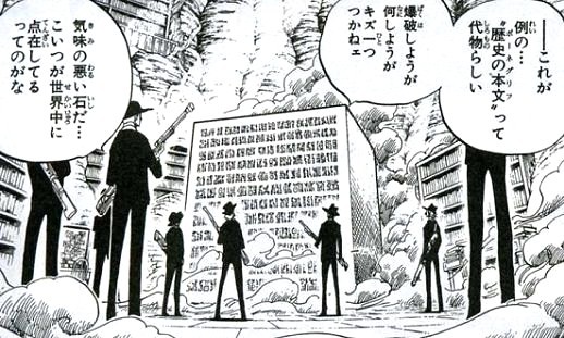 世界中に点在する、歴史を示した石碑。決して砕けない石碑に、古代文字で歴史が刻まれており、古代文字の知識をもつ者にしか解読できない。石碑は、「情報を持つ石」と「その石のありかを示す石」の2種類がある。世界政府は、「歴史の本文に記された古代兵器復活の可能性」を理由に、歴史の本文の探索および、解読を死罪と定め禁止している。(ただし、歴史の本文の存在を知る程度なら罪にはならない)。しかし、今は亡きオハラのクローバー博士は研究の結果、歴史の本文を残した古代王国の存在を突き止め、「その国の思想が世界政府にとって脅威であるため、世界政府は歴史の本文の探索と解読を禁止している」という仮説を立てた。