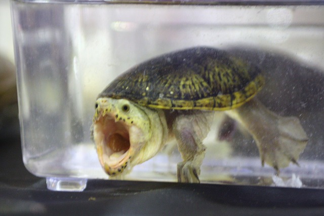 ハラガケガメさんは成長しても13〜15cmほどで小型ですが、とっても気性が荒い!!