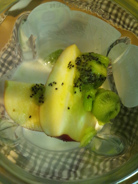 材料は、キウイフルーツ2個・りんご半分・牛乳少々。
