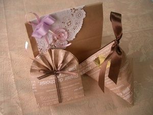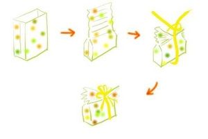 | (3)市販の袋を、おおきなリボンのようにかわいくアレンジしたラッピング★ これなら、リボンと袋だけでも、かなり見栄えがあるラッピングができそう〜!! | |
