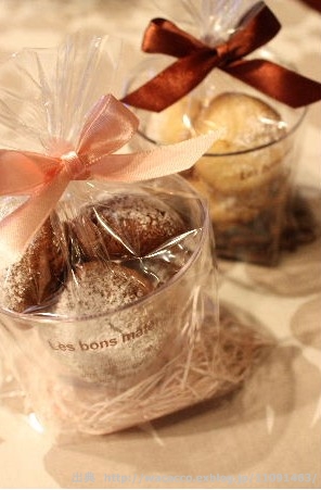 | (2)透明なプラスチックカップを使ったナイスアイデアなラッピング★ 中身がこわれやすい、マカロンや、 ほろほろのクッキーなんかに適していそうです♪^^ | |