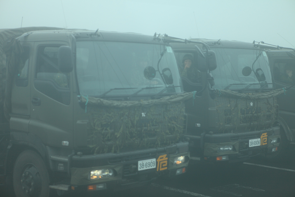 なぜか軍用車が停車していました。霧に溶け込んでちょっと不気味です。