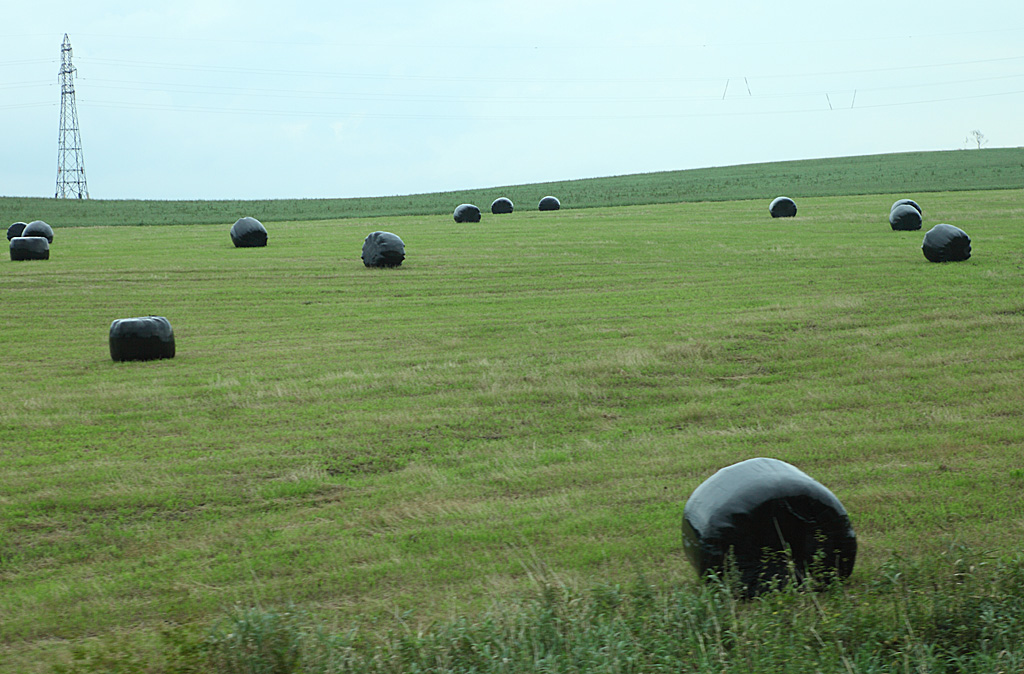 この黒い塊は「牧草」です。冬の間牛に食べさせる草が無いために、こうして超圧縮して保存しておくそうです。数百キロの重さを圧縮してあるそうです。