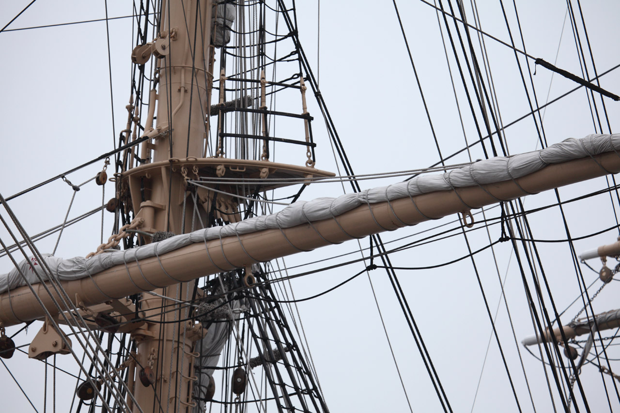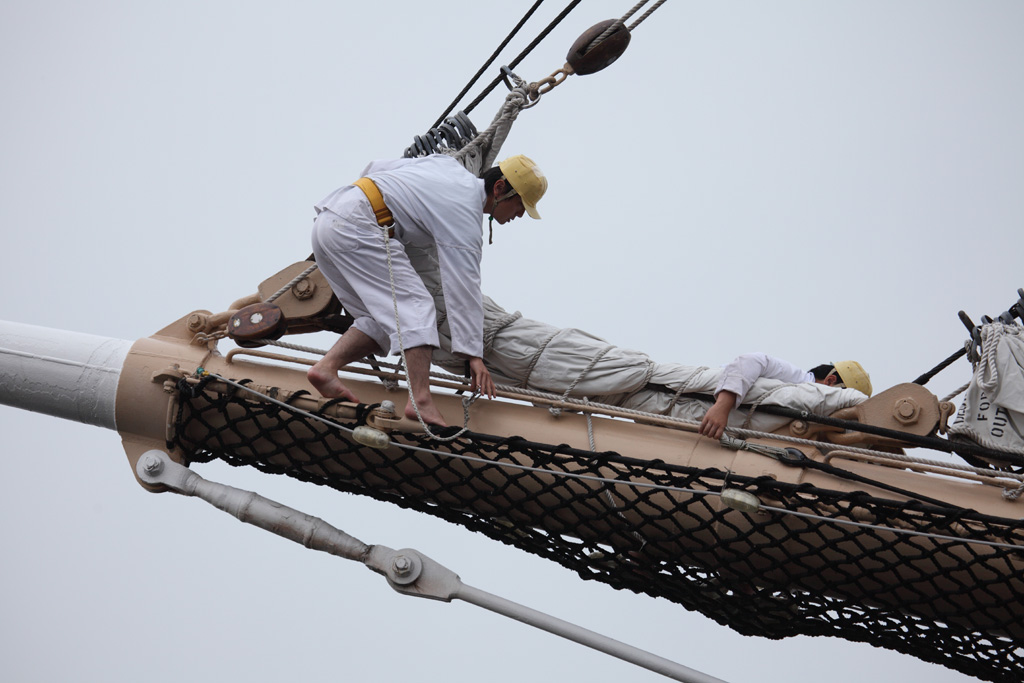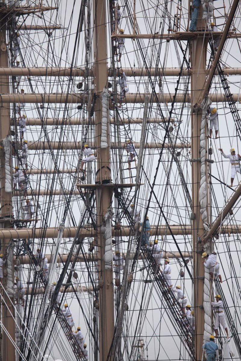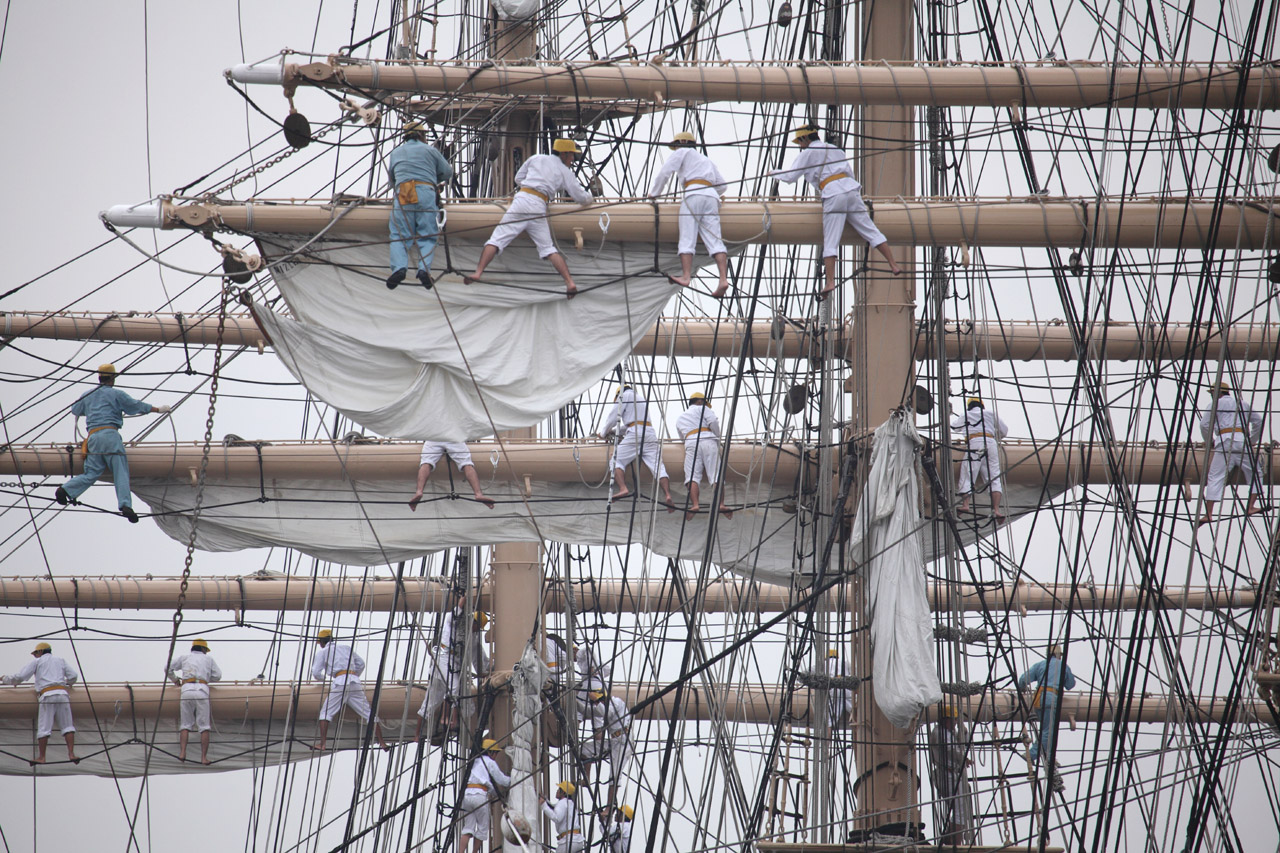 メーンマストの帆を降ろしています。船員はすべて男ではなく、女性の訓練生も混ざっています。