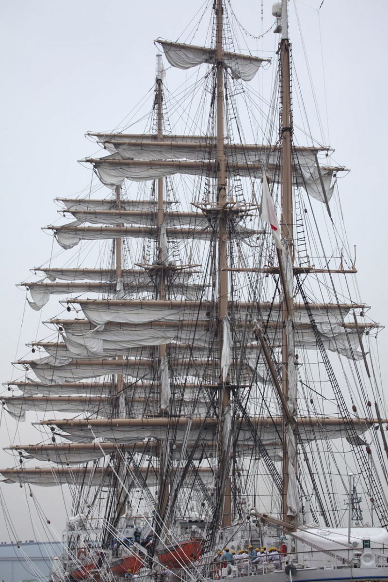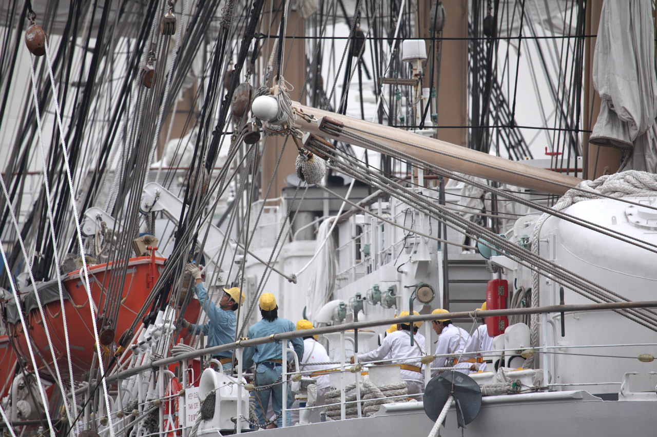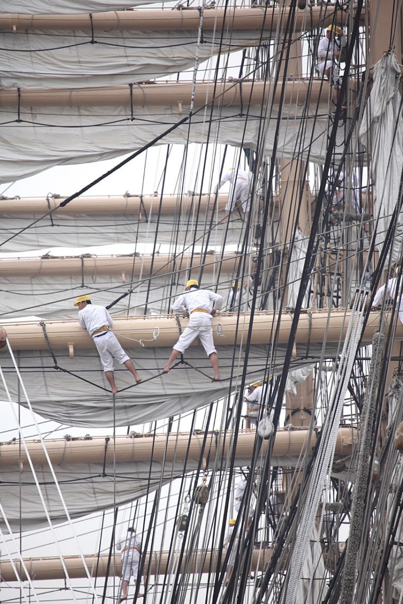 だんだん帆船らしくなってきました。作業を開始して総ての帆を張り終えるまでおよそ40分かかります。帆を張り終える瞬間が一番危険だそうです。風の影響をまともに受け始め、船体が大きく揺れるからだそうです。