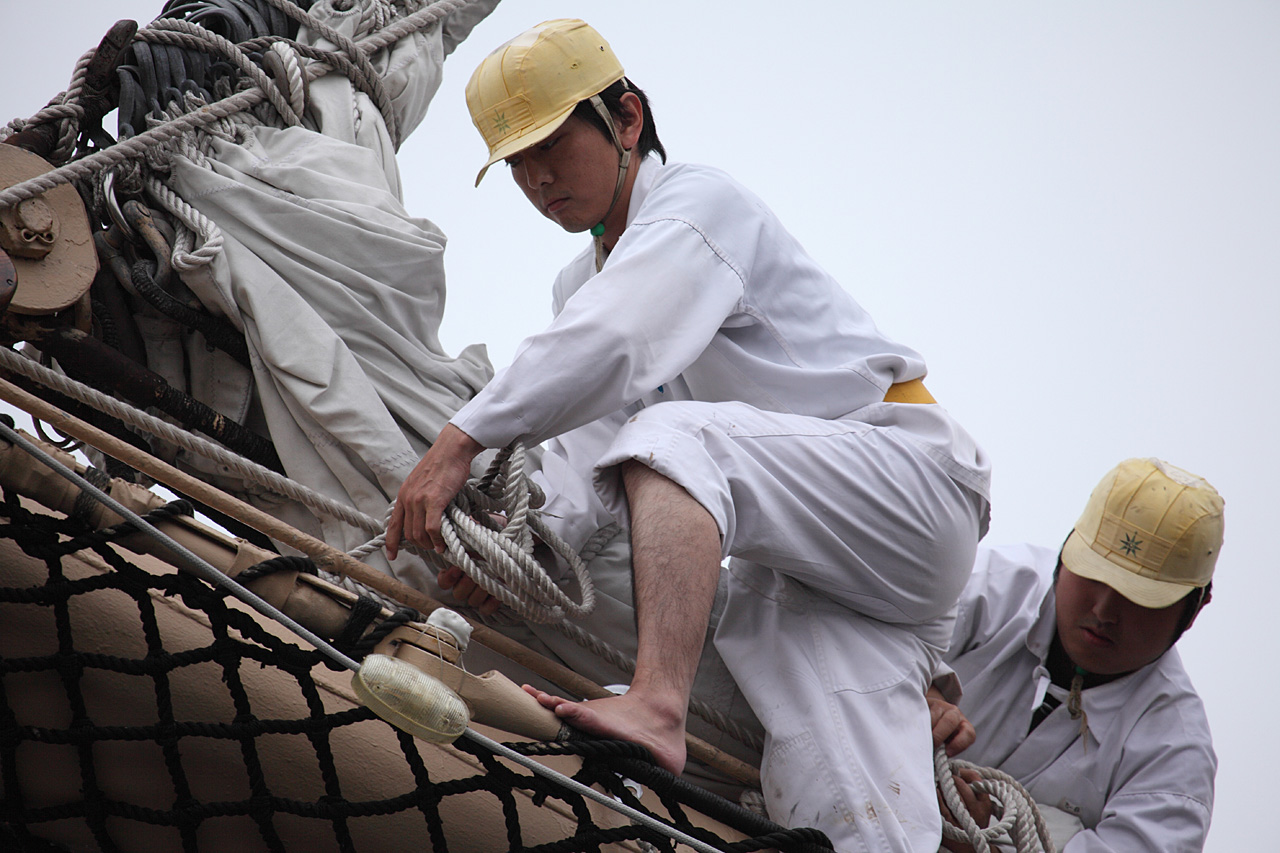船員はすべて裸足です。靴をはかない理由は、靴ですとロープの損傷などが肌で感じることができず、異常を発見しづらいからだそうです。目だけではなく、脚の裏でもチェックを行うのです。
