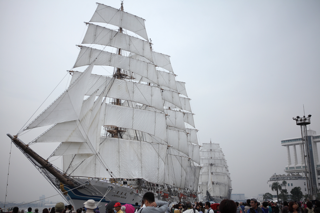 前回横浜で日本丸は、中にも入っていますし、晴れたときのセイルドリルも以前まにあ道でも紹介しています。今回曇りというのが本当に悔やまれますが、所有者(船の)関係で、今後同時入港はいつになるのか解らない状態ですし、今後2度とないかもしれません。この勇姿を撮影できたことは本当にカメラマンとしていいチャンスをもらったと思います。