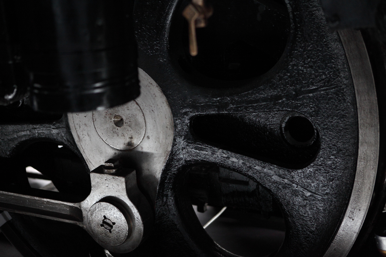 「ガシュン」って車輪が動きそうです。鉄の硬いイメージを出すために絞りたいのですが、絞るとSSが長くなってしまいます。全体を撮影するのではなく切り取ることにより、被写体を強調することができます。