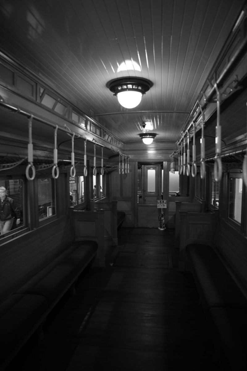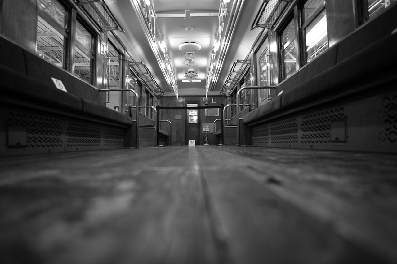 板張りの列車です。床にカメラを固定して、最大広角にして、モノクロ処理をしてみました。ノスタルジーな感じで・・