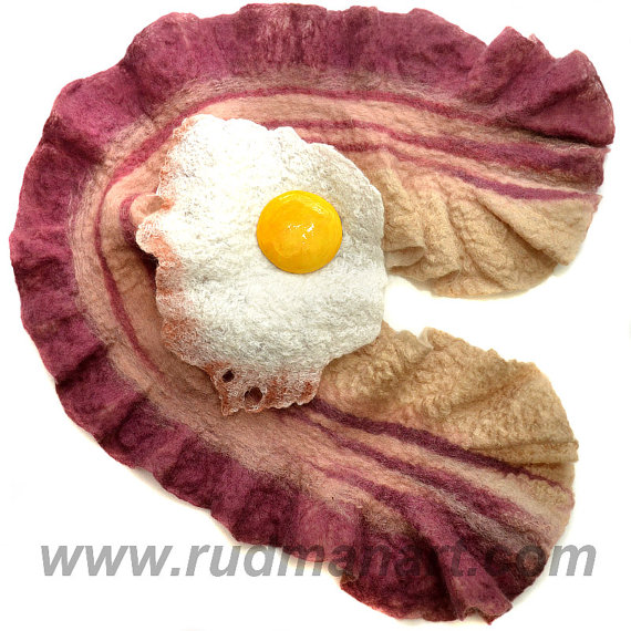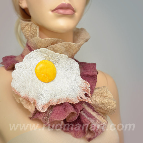「Felted bacon scarf with fried egg brooch」はウールとシルクで手作りしたベーコン似のスカーフ。さらにウールと紙粘土で作った目玉焼きの形の大きなブローチがついてきます。首に巻いてブローチをつければ、襟元を朝食の定番メニューで飾ることができます。ブローチは取り外しでき、ベーコンだけを身にまとうことも可能。見る人がお腹を鳴らしてしまうかも。