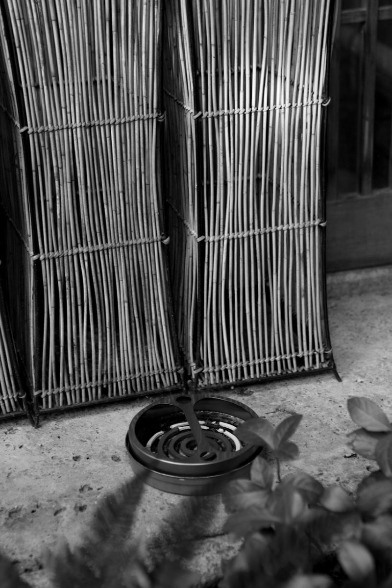 庭先にあった香取線香。最近見なくなりましたね。うしろのすだれとの組み合わせが「夏の京都」を演出しています。モノクロ加工で仕上げています。