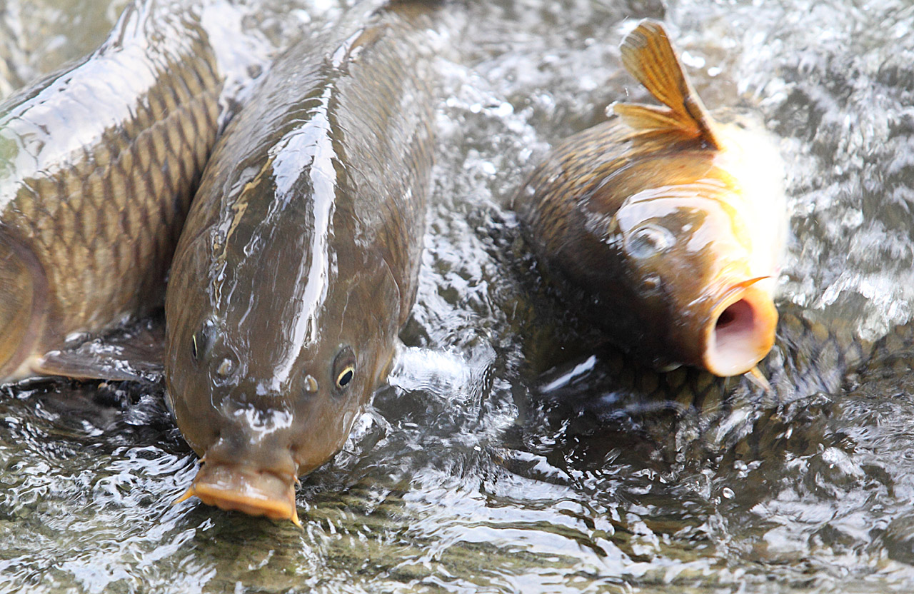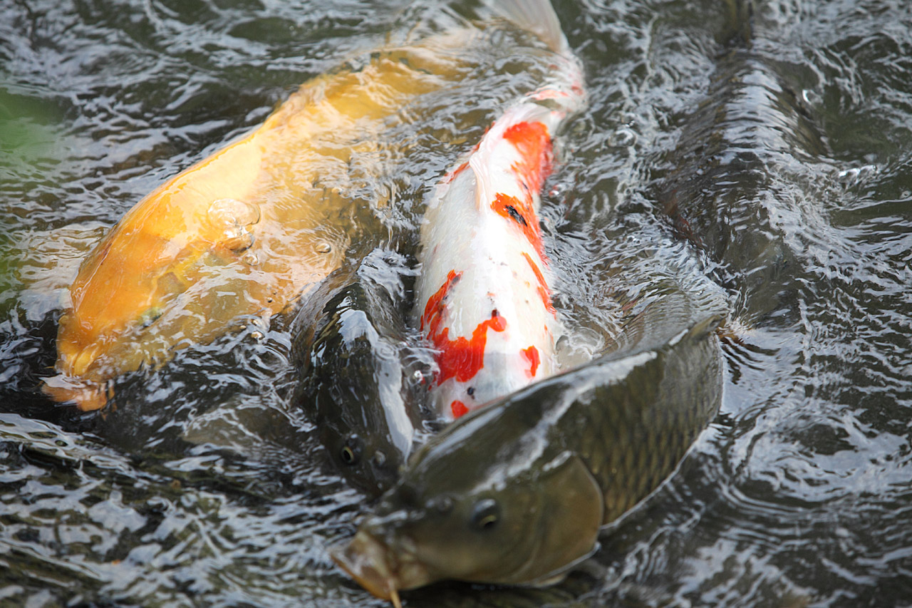 人が来ると餌がもらえると知っているようです。一番右の鯉は体ごとアタックしています。目も裏返っています。