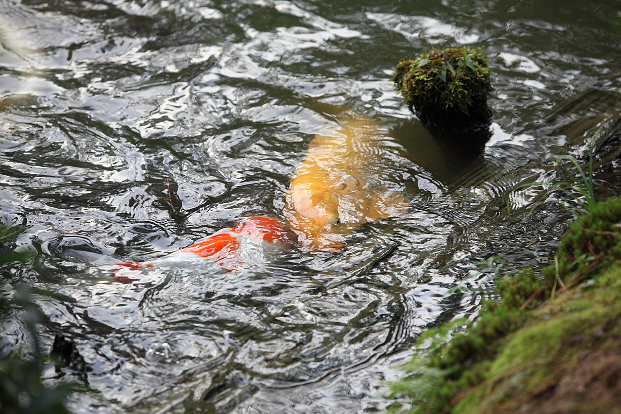 面白いことに、この後白赤の鯉は手前の黒い鯉にボディアタックをしかけるのです。