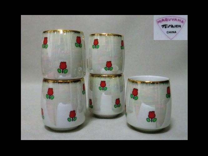 昭和レトロ 1970年代(推定) 日本製 ラスター・金彩 チューリップ柄 湯呑み5客 未使用保管品