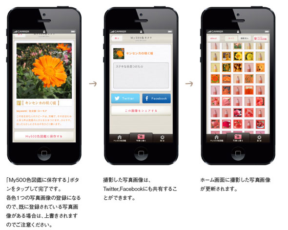アプリは、撮影した対象物が500色のどれかに該当すると、画面内のアイコンが点滅してお知らせ。写真を保存し自分だけの“500色図鑑”を作ることができるそうです。ほかのユーザーと一緒に作るWebコンテンツ「みんなの500色図鑑」やSNSへの投稿も可能となっています。