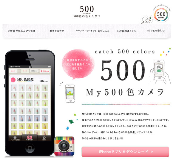 「500色の色えんぴつ」を販売するフェリシモが、身近なものや風景にカメラを向けて500色すべてを見つけ出し、コンプリートを目指して楽しむiPhone向けカメラアプリ「My500色カメラ」を公開しました。ダウンロードは無料です。