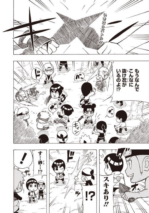 しかしリーが隙を見せてしまった!!そこを抜け忍が狙うと・・・砂がリーを守ってくれました!砂と言うことは・・我愛羅率いる砂の三兄弟!我愛羅は、どうやら火影に用があって木の葉に向かっていたようです。