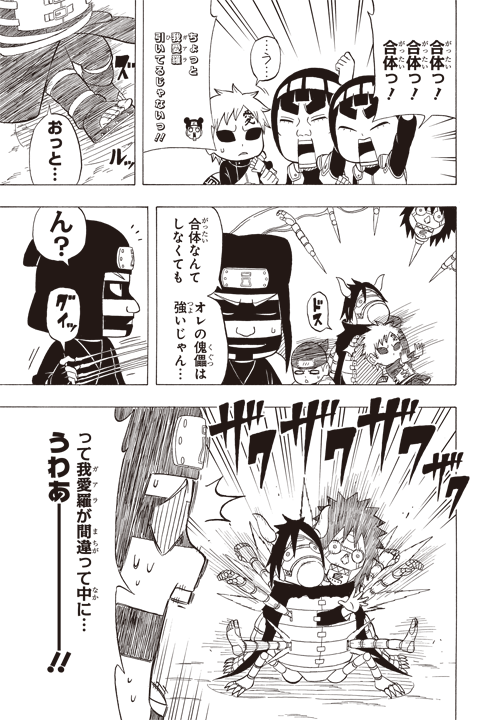 そしてカンクロウが傀儡で助太刀!そこにリー&ガイが傀儡で合体してと無茶ぶりにツッコミを入れるカンクロウ!忍術でもそう簡単には合体はできそうにありませんね。しかしまだ無茶ぶりに我愛羅が引いてしまう・・・。カンクロウが合体なんかしなくても傀儡は強いと言っていると・間違って・我愛羅を傀儡の中へ閉じ込めてしまった!!!しかもグイッと刃物を傀儡の中にドボン!我愛羅は大丈夫でしょうか?