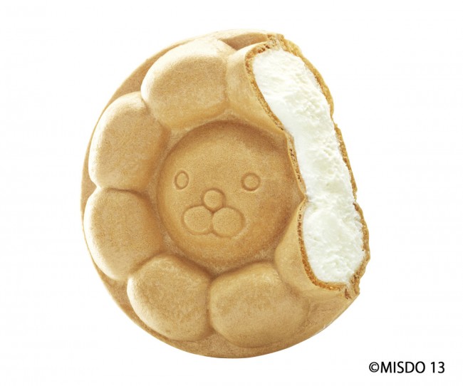『ポン・デ・リング もなかアイス』は、濃厚なバニラアイスクリームを、オリジナルキャラクターである“ポン・デ・ライオン”の形をかたどったもなかでサンドしたアイス。