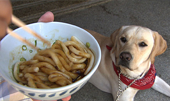 伊勢うどんのお店で麺をいただくまさはる君、麺をすすれなくて・・・!?