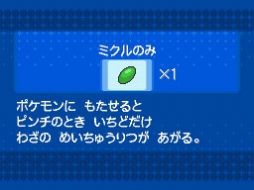 持ち物は、通常のプレイでは手に入れることのできない「ミクルのみ」。このきのみを持ったポケモンがプレゼントされるのは、今回が初めて!