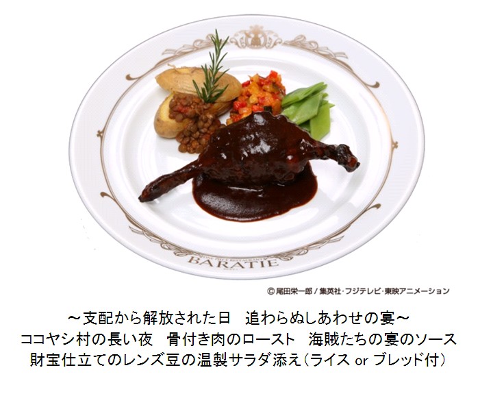 メニューはキャラクターやシーンをイメージし、昼はアラカルトとワンプレート料理を用意。夜はアラカルトの他、「エピソードイーストブルー」と題したコースメニューやオリジナルのカクテルやソフトドリンクなども提供する。数カ月に一度はメニューをリニューアルしていくという。【ねとらぼ コピペ】