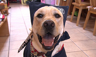 ワンちゃんグッズの店を発見し訪ねると、レンタル出来るワンちゃん用忍者の衣装が!さっそくまさはる君もレンタルし忍者ルックに。まさはる君の忍者姿にご注目!