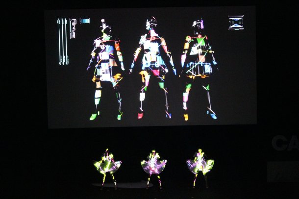 なおグローバルサイトでは今月13日より、WEB上でPerfumeの3Dモデルにユーザーが自由にアニメーションを描いて投稿できるという新しいプロジェクトが行われており、今回の「カンヌライオンズ」でのパフォーマンスには、そこに世界中から集まった作品が用いられた。パフォーマンス中、メンバーのバックに設置されたスクリーンには投稿された中から選ばれた作品が並べられ、その絵がポンとスクリーンを飛び出してメンバーの衣装へと移動する。またパフォーマンス中盤には衣装にたくさんの文字が映し出されたが、これはグローバルサイトで募集したファンからのTwitterの投稿。「Perfumeが世界のどこにいても、ファンとライブ空間でつながることができる」ということを実証する、彼女たちらしいコンセプチュアルな演出となった。