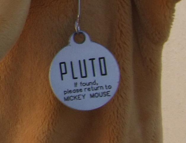 ・プルートの首輪には「みつけたらミッキーまで」と書いてある