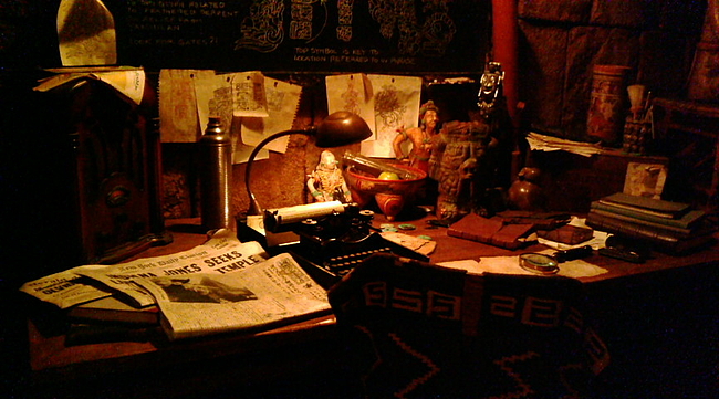 インディージョーンズの待ち列にはインディ博士の仕事机があって、そこには新聞が★