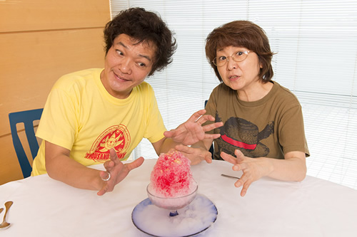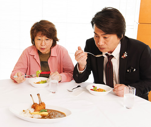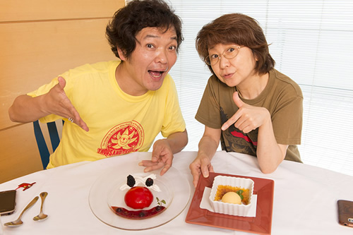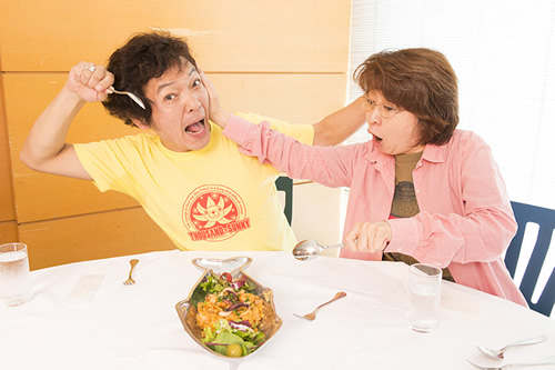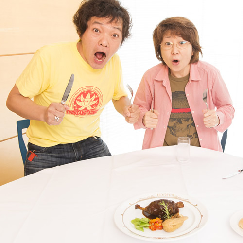 田中真弓さんと勝平さんは、ナイフとフォークを片手に、