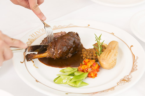 「骨付き牛肩ロース肉のロースト 海賊たちの宴のソース 財宝仕立てのレンズ豆の温製サラダを添えて」。