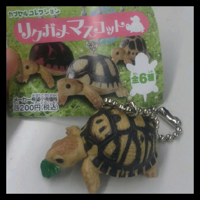 1回200円で、全6種類のオリジナルリクガメさんのフィギュアが出てきます♪ リクガメさんの種類はとくに決まっていませんが、ケヅメ・ヒョウモン・ホシガメがモチーフになっているかわいらしいデザインで、つぶらな瞳がかわいすぎるっ!!(≧▽≦)