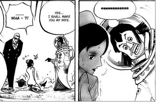 サンジの頭の中を覗いたヴァイオレットは、悲鳴を上げ、ふしだらなっと言い座り込みました!サンジの頭の中はピンク一色!サンジは作戦も目的も考えておらず、ヴァイオレットが「殺してほしい男がいる」と言ったのは本当だったと見抜き「おれは女の涙を疑わねェっ!!」と言います!トレーボル軍の部下達が懸賞金7千7百万のサンジの首を取ろうと攻撃をしかけますが、ヴァイオレットが 熱鉄の涙 目鯨で部下達に攻撃し全滅させてしまいました!