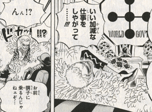 世界政府のそんな対応に、七武海が振り回せる権力の域を越えていると驚くサンジ!そんなサンジからの連絡を受けたロー!元帥サカズキ率いる海軍本部すら誤報に踊らされた事を知った藤虎!サカズキは立腹しており、マリージョアの五老星に掛け合ってくると言います。ローの所へ上半身を咲かせたロビンに、交渉は不成立、グリーンビットからすぐに脱出するとローが言いますが、ロビンはウソップと地下(小人族のトンタッタ王国)にいる事を告げ、約束の港には後で必ず向かうと言い、先に脱出してと伝えます。
