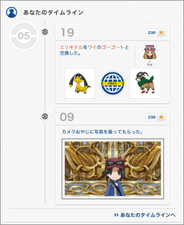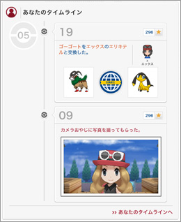 ポケモングローバルリンクにゲームシンクをすると、それまでの自分の日々の冒険の記録が、タイムラインとして記録され、ひと目でわかるようになる。このタイムラインは、ほかのプレイヤーでも見ることができるように公開設定をしたり、一部のSNSサイトに情報を共有(シェア)したりすることができるぞ!