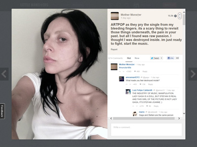 今年11月に新作アルバム「ARTPOP」をリリース予定のレディー・ガガが、自身で立ち上げたSNS「LittleMonsters」で公開したすっぴんが「誰だかわからない」と話題になっている。