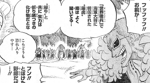 ドレスローザ編になって、強力な新キャラが次々に登場し、ドフラミンゴや大将藤虎が登場で一気に白熱するワンピースですが、ドフラミンゴの一言でまた新たな大将の名がわかりました。