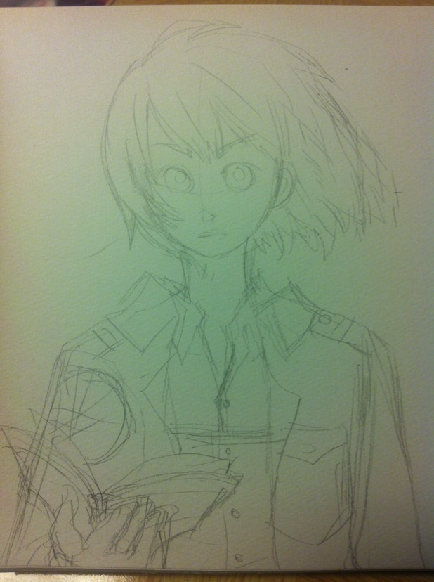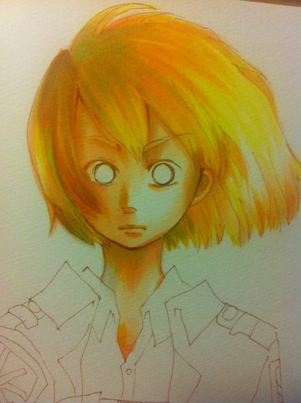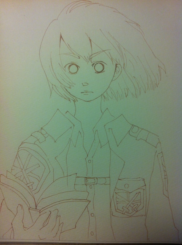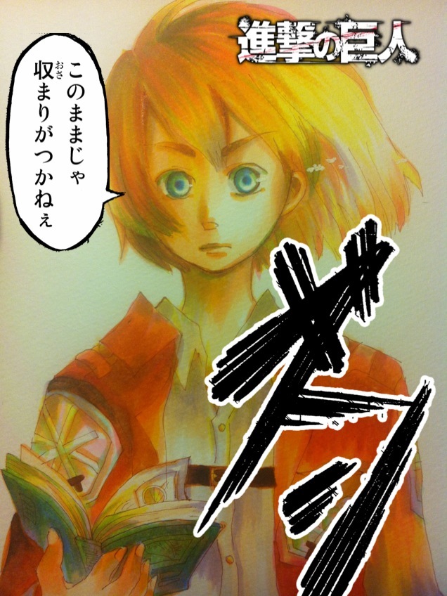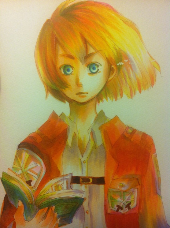 個人的には、本を持っている手の爪の立体感、訓練兵のワッペンの混色具合、本の古びてにじんだ色合い、黄色の効かせぐあいを表現するのが